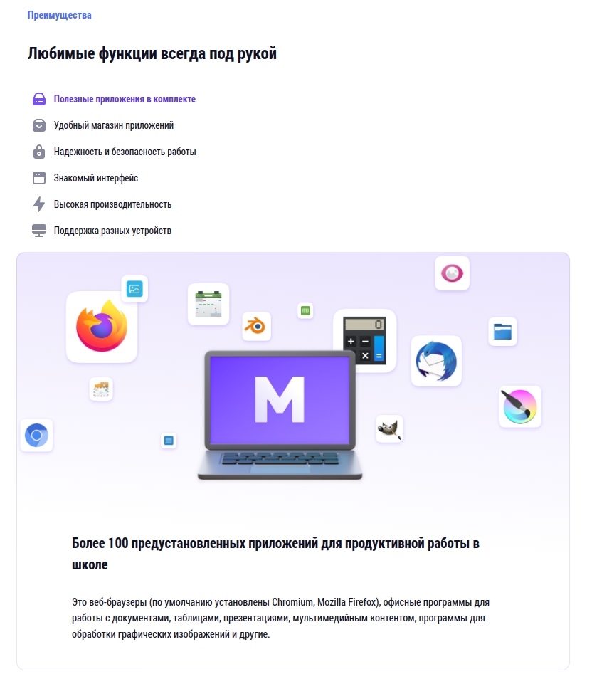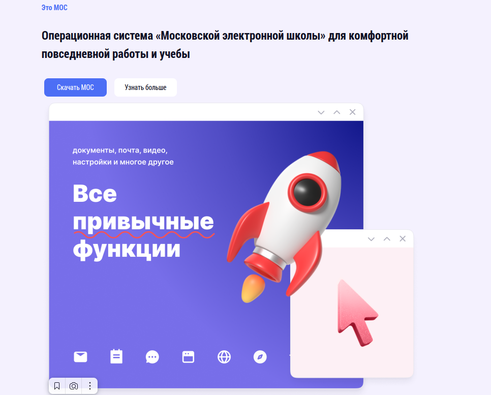 В основу Операционной системы «Московской электронной школы» для комфортной повседневной работы и учебы - легла Операционная система Rosa Хром. Операционная система Rosa Хром - разрабатывается и собирается с использованием проверенных и безопасных компонентов на собственной независимой платформе сборки. Рабочее окружение операционной системы - удобная и максимально настраиваемая среда Плазма, а инженеры и разработчики команд участников проекта активно дорабатывают новые функции и делятся им с сообществом, поэтому все актуальные изменения и улучшения сразу попадают в репозитории РОСЫ и МОС.